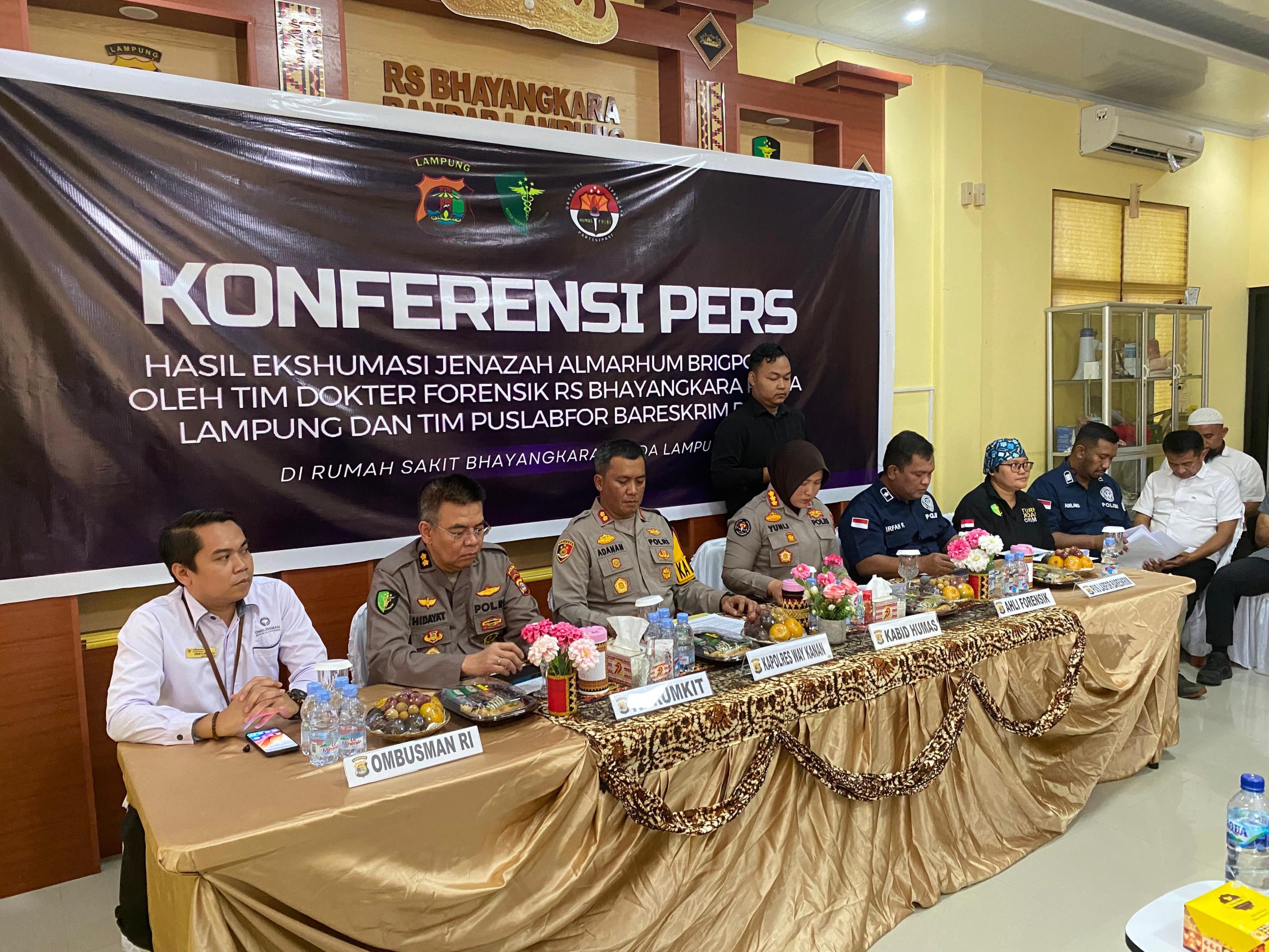 BANDAR LAMPUNG, matapubliknews.id – Kepolisian Daerah Lampung menggelar Konferensi Pers terkait hasil Ekshumasi Jenazah Almarhum Brigpol EA oleh, Tim Dokter Forensik Rs. Bhayangkara Polda Lampung dan Tim Puslabfor Bareskrim Polri Kematian Brigpol EA di RS Bhayangkara Polda Lampung, Selasa, 15 Juli 2025.