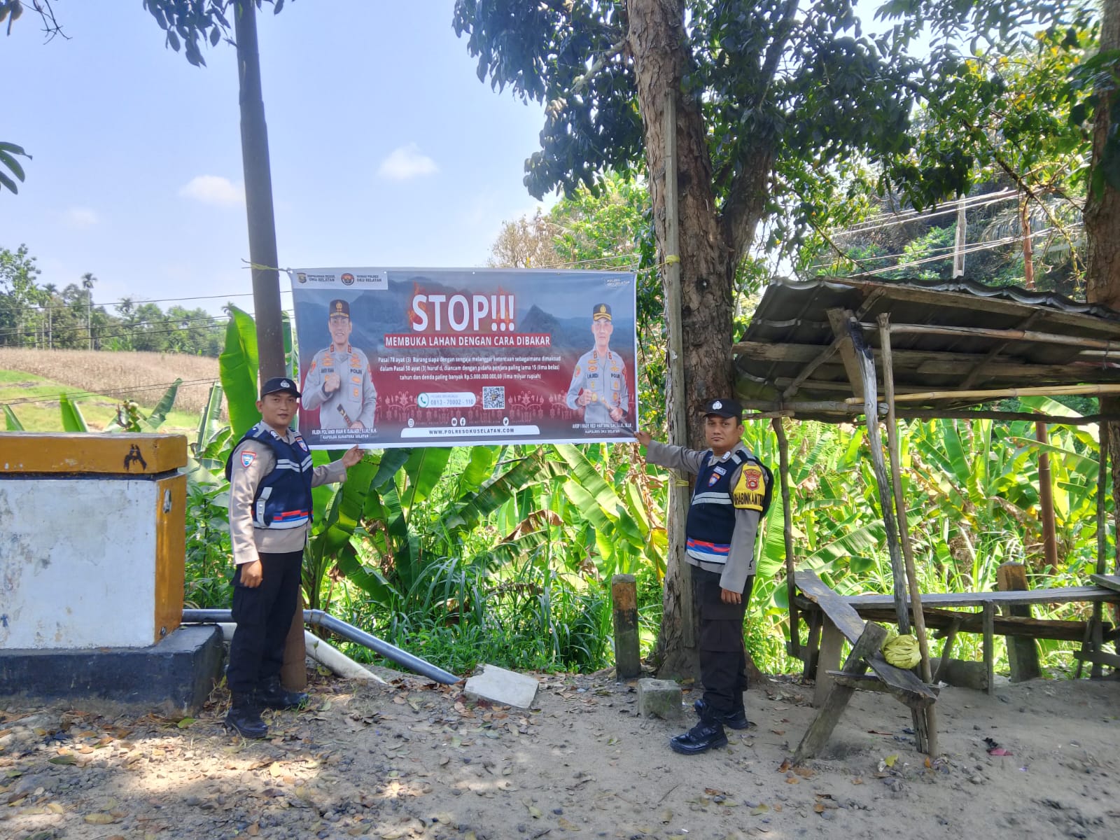 Sepanduk yang dipasang berukuran besar dan ditempatkan di lokasi-lokasi mudah terlihat, terutama di sepanjang jalan utama dan titik-titik yang sering digunakan warga, untuk membuka lahan pertanian atau perkebunan. Dalam sepanduk tersebut tertulis jelas pesan: “Stop!!! Membuka Lahan Dengan Cara Dibakar.”
