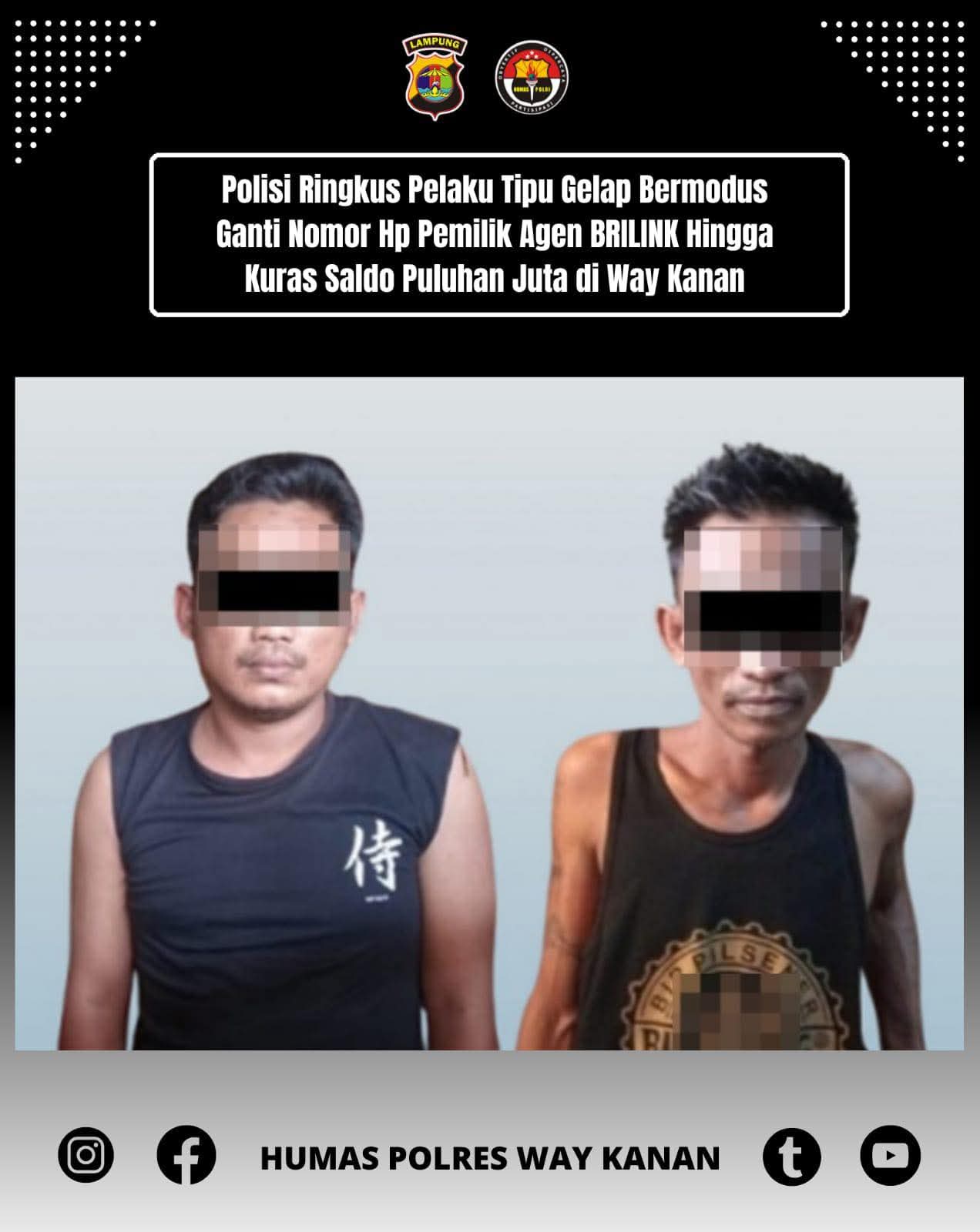 Kasatreskrim AKP Sigit Barazili mengatakan setelah pihaknya melakukan penyelidikan, Tekab 308 PRESISI Satreskrim Polres Way Kanan di back up oleh Unit Reskrim Polsek Panjang Polresta Bandar Lampung pada hari Selasa, 22-07-2025 sekitar pukul 07:30 WIB berhasil menangkap JY dan BS di Kelurahan Karang Maritim Kecamatan Panjang Kota Bandar Lampung tanpa disertai perlawanan.