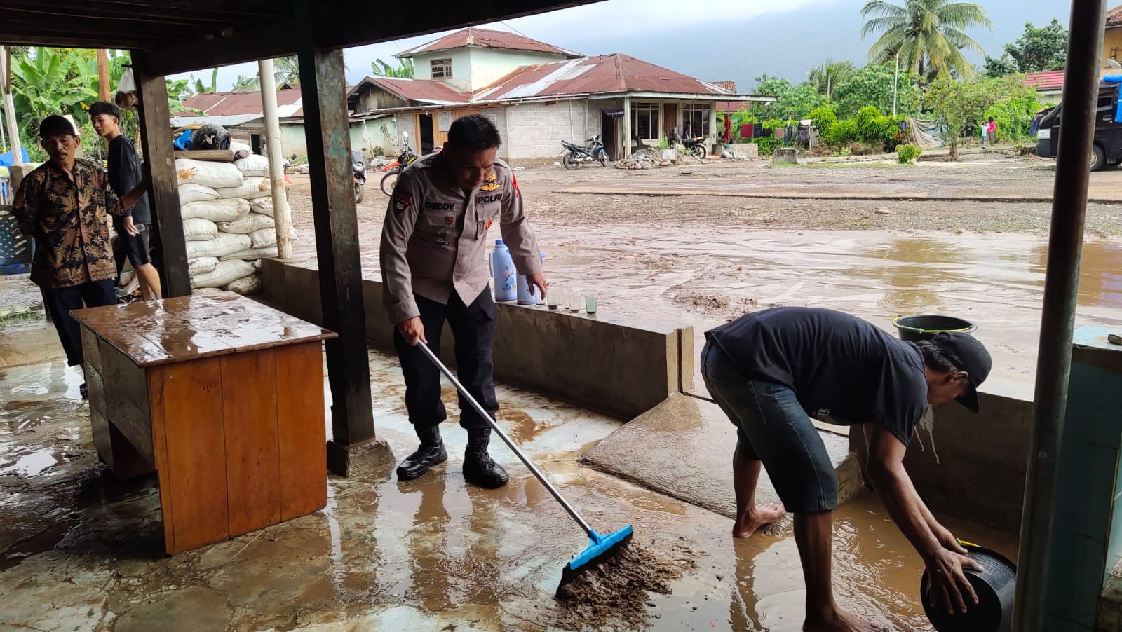Tampak personel Brimob sedang membantu melakukan pembersihan sampah, dan Lumpur yang ada di rumah warga yang terdapat banjir kegiatan ini dipimpin oleh, Dan Pos Aipda Dedi Zantoni. (Azis)
