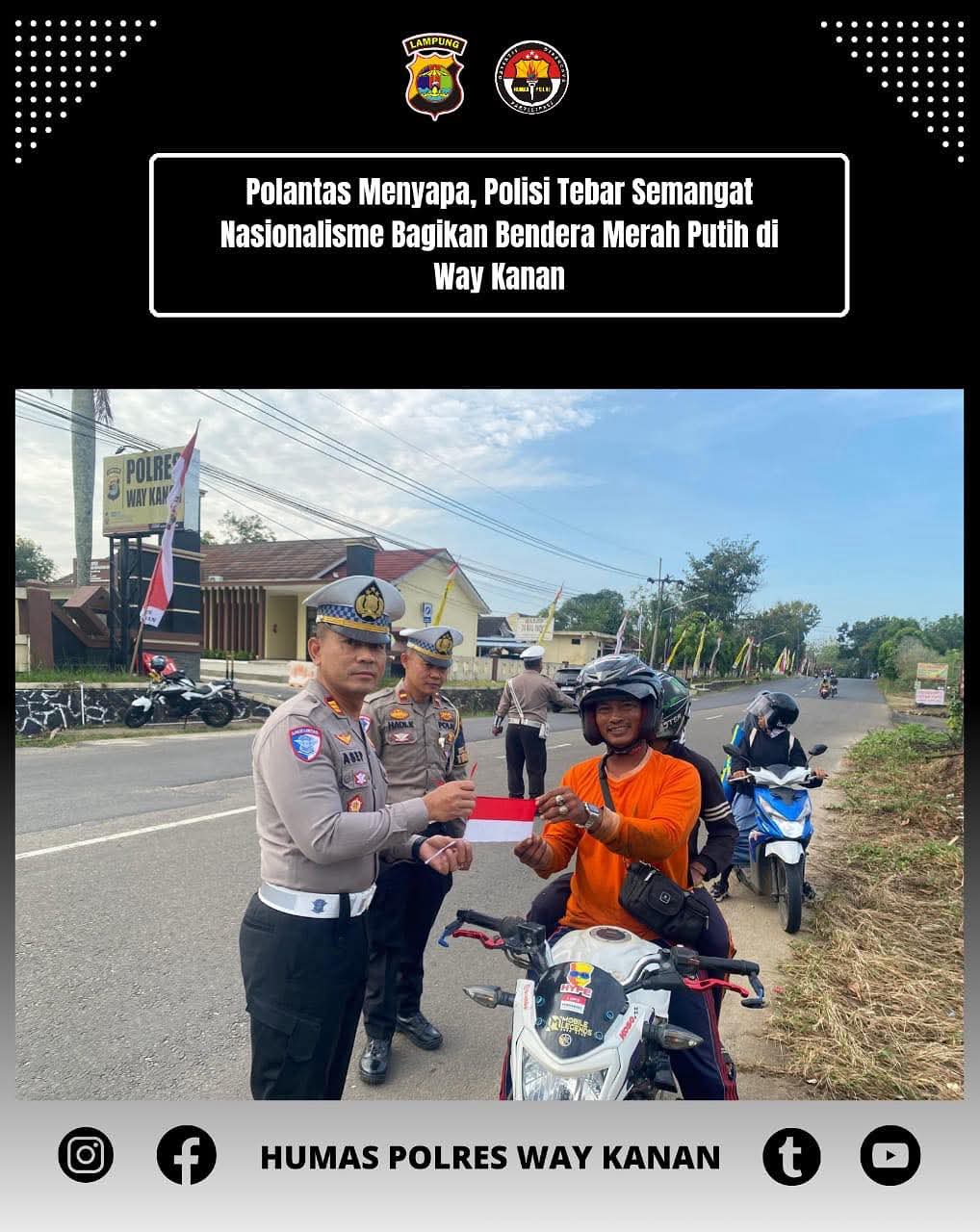 Polantas Menyapa, Polisi Tebar Semangat Nasionalisme Bagikan Bendera Merah Putih di Way Kanan