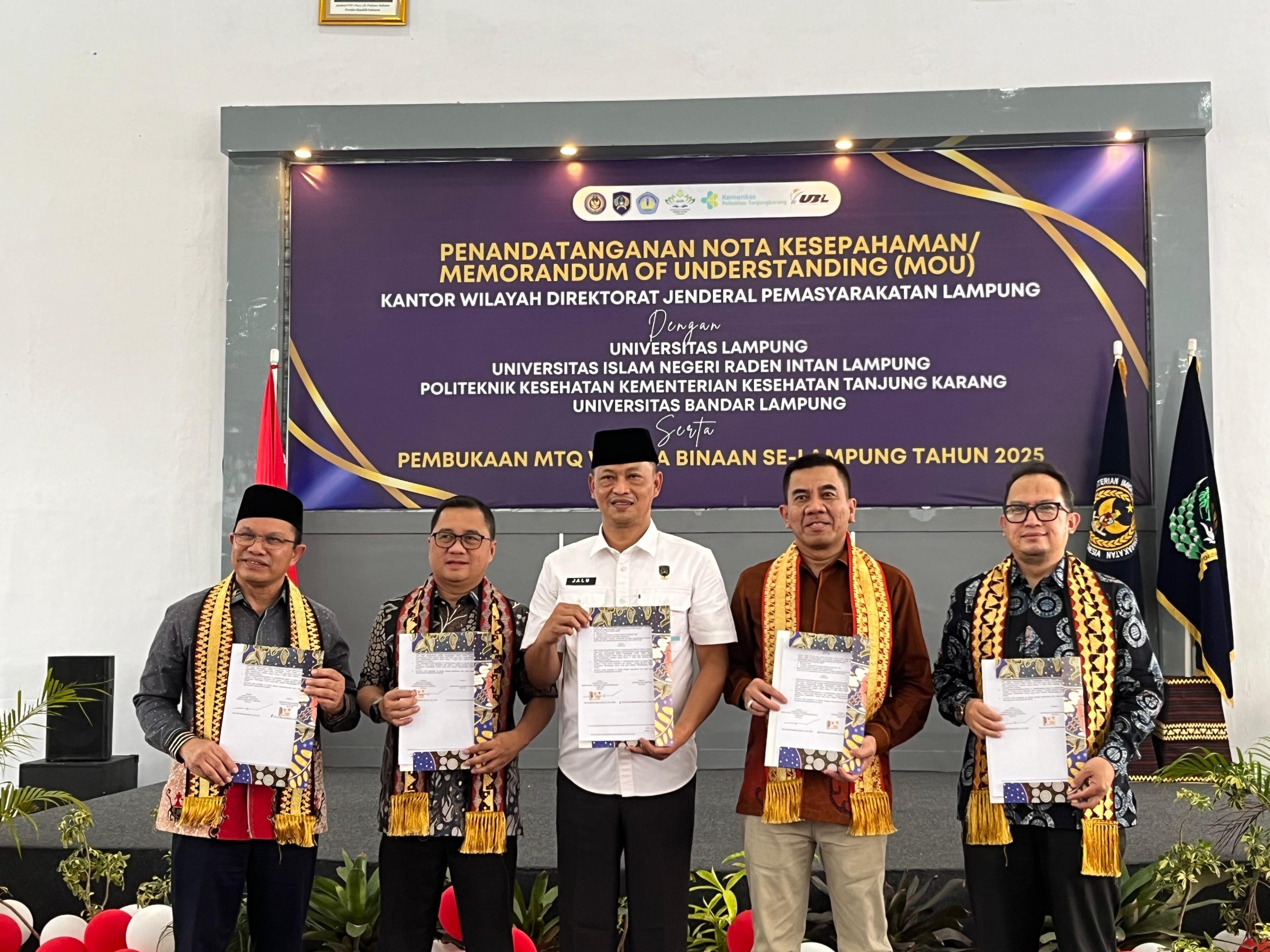 BANDAR LAMPUNG, matapubliknews.id — Kantor Wilayah Direktorat Jenderal Pemasyarakatan (Kanwil Ditjenpas) Lampung bersama Universitas Lampung, UIN Raden Intan Lampung, Poltekkes Tanjung Karang, dan Universitas Bandar Lampung (UBL) resmi menandatangani Nota Kesepahaman (MoU) terkait implementasi Tridharma Perguruan Tinggi dalam mendukung sistem dan fungsi pemasyarakatan. Jum’at, 15 Agustus 2025.