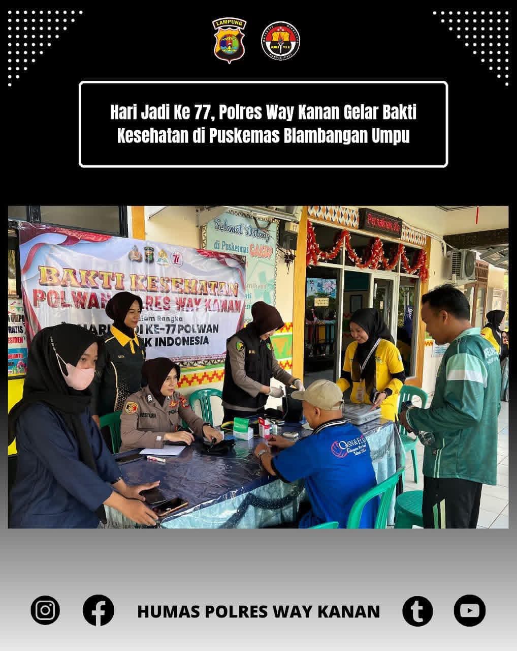 WAY KANAN, matapubliknews.id – Dalam rangka Hari Jadi Polisi Wanita Republik Indonesi ke 77 tahun 2025 Polres Way Kanan Polda Lampung, menggelar aksi bakti kesehatan yang berlangsung di Halaman UPT Puskemas Blambangan Umpu. Minggu, 31 Agustus 2025.