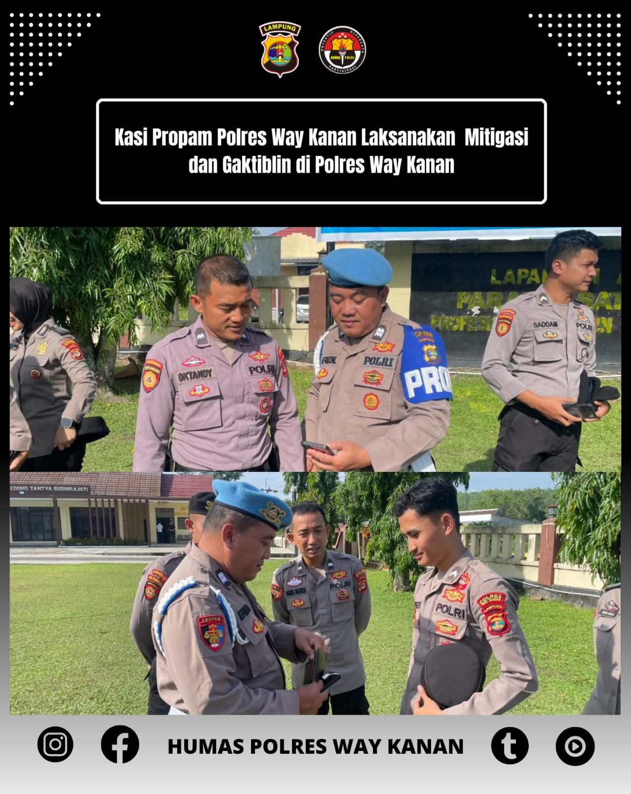 WAY KANAN, matapubliknews.id – Seksi Propam Polres Way Kanan melaksanakan kegiatan Gaktiblin (penegakan ketertiban dan kedisiplinan) dan Mitigasi Pelanggaran Disiplin, setelah usai pelaksanaan apel pagi terhadap personel di Mako Polres Way Kanan. Jum’at, 24 Oktober 2025.