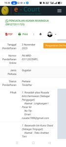 OKU SELATAN, matapubliknews.id – Rosadah Binti Darmawan, didampingi oleh kuasa hukumnya, Pahrul Rozi, S.H., menghadiri sidang gugatan cerai terhadap suaminya, Basarudin Bin Uci Daud, di Pengadilan Agama Muaradua, Kabupaten OKU Selatan, pada hari Rabu, 19 November 2025.