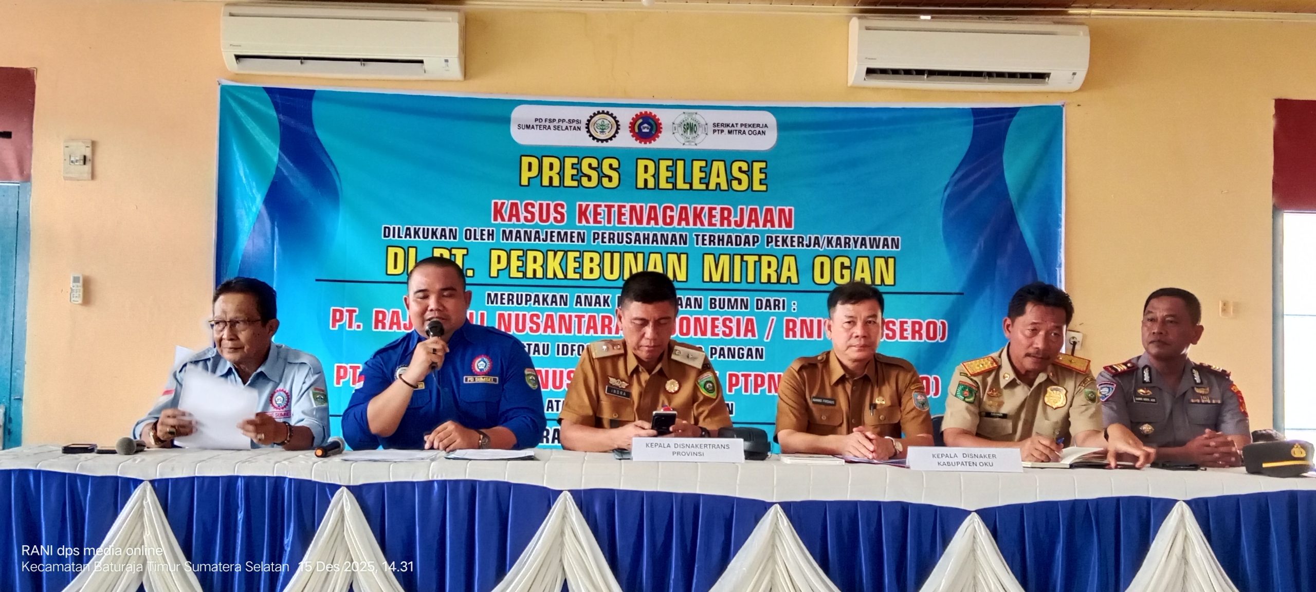 BATURAJA, matapubliknews.id – Pengurus Daerah Federasi Serikat Pekerja Pertanian dan Perkebunan – Serikat Pekerja Seluruh Indonesia (PD FSP.PP-SPSI) Sumatera Selatan, mengadakan diskusi, penyampaian aspirasi dan press release Kasus Ketenagakerjaan dengan sejumlah perwakilan serikat pekerja PTP. Mitra Ogan di Gedung Aula WASNAKER OKU Raya, Baturaja, Kabupaten OKU, pada Senin, 15 Desember 2025.