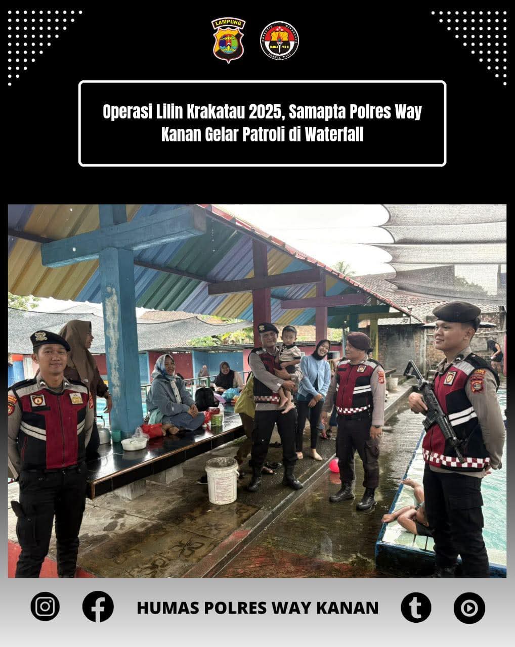WAY KANAN, matapubliknews.id – Samapta Polres Way Kanan melaksanakan patroli KRYD (Kegiatan rutin yang ditingkatkan), dengan menyambangi objek wisata kolam renang waterfall bertempat di Kampung Setia Negara, Kecamatan Baradatu, Kabupaten Way Kanan. Rabu 31 Desember 2025.
