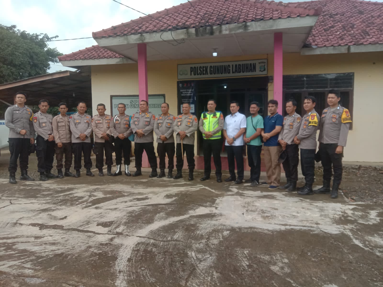 Kedatangan Kapolres disambut langsung oleh Kapolsek Gunung Labuhan, AKP M. Lusy, S.S.H., beserta seluruh jajaran anggota Polsek di halaman Mapolsek setempat.
