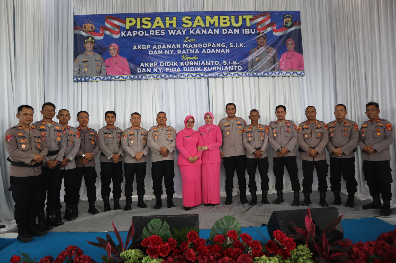 Upacara ini dipimpin oleh langsung pejabat lama AKBP Adanan Mangopang, S.I.K., yang saat ini menjabat sebagai Wadir Narkoba Polda Lampung dan pejabat baru, sebagai Kapolres Way Kanan AKBP Didik Kurnianto, S.I.K., dengan dihadiri oleh para Pejabat Utama, Kapolsek, personel Polres Way Kanan dan Bhayangkari.